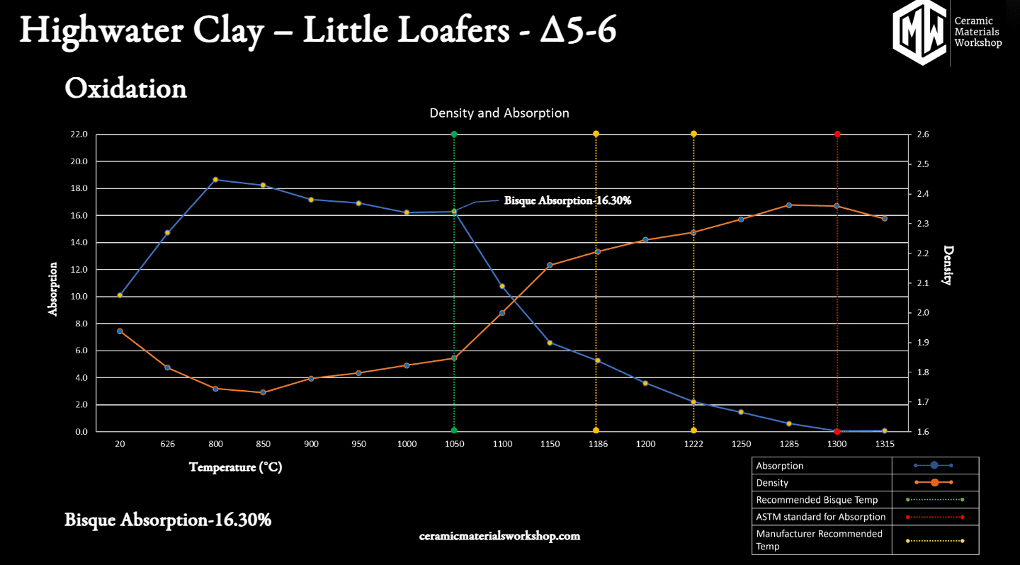 A full profile shows exactly where vitrification starts and ends, when the clay fully tightens up, and—critically—when it begins to bloat or weaken. For Little Loafers, this testing reveals that even before the recommended maximum temperature, the body is already too porous for high-durability functional work.